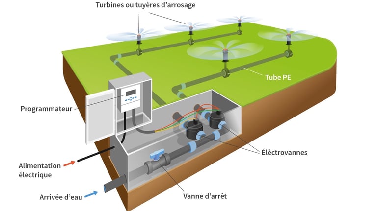 L’eau circule dans les tuyaux et se répartit à travers des arroseurs ou des goutteurs placés aux bons endroits. Le tout assure un arrosage régulier, économique et sans effort, pour un jardin toujours bien entretenu.